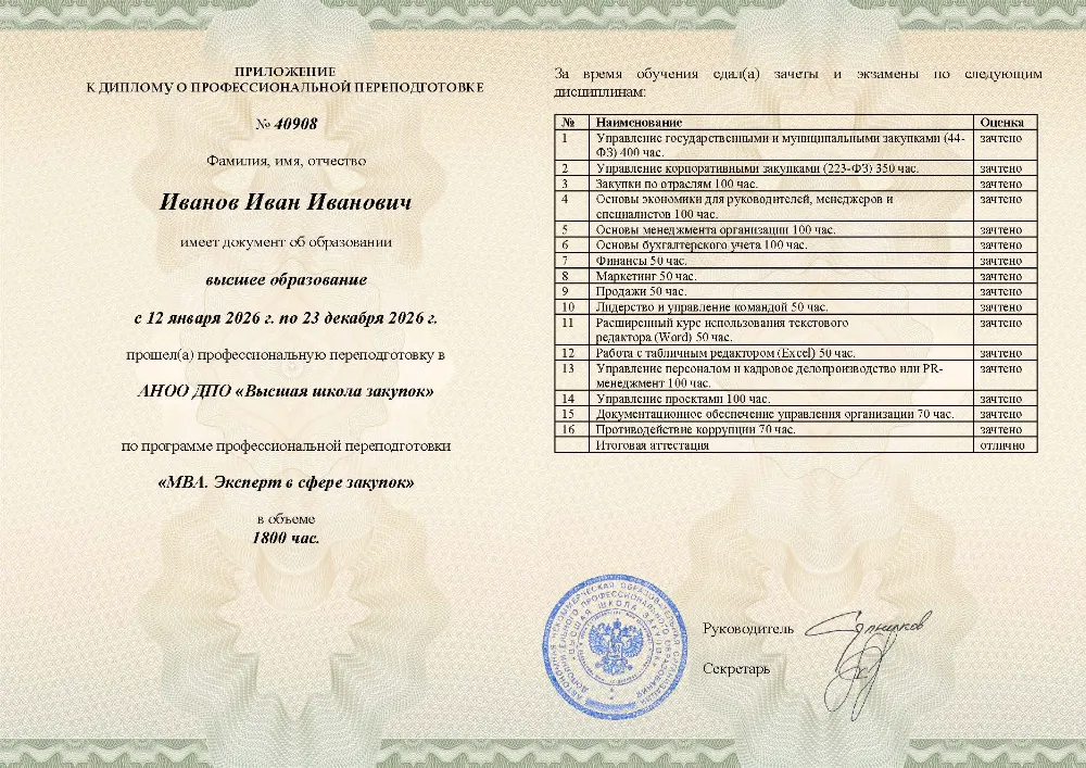 Вы получаете престижный диплом о профессиональной переподготовке с присвоением квалификации эксперта (MBA). Высшая школа закупок (fz44.org) в обязательном порядке вносит сведения об обучении в Курске в реестр Рособрнадзора, подтверждая ваш высший квалификационный статус.
